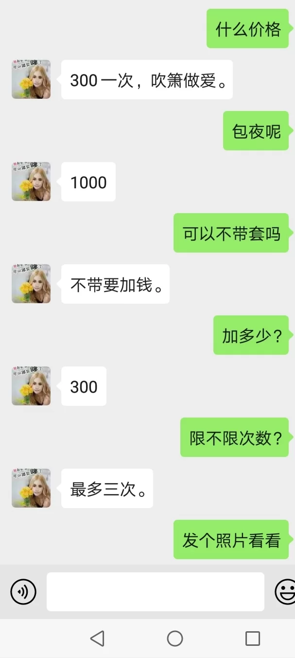 加了微信,这大姐还是比较警惕的,刚开始问价格,大姐说带t300一次,包y1000,不带还要加300百,限3次,后面聊着聊着,价格砍到八百,5次,都怀疑自己的砍价能力了,无t内射,真是爽歪歪,昨晚5次无t内射,感觉滑滑暖暖的,今早腿都软了,值得推荐,关键ly们要会还价,不然大姐漫天要价的感觉