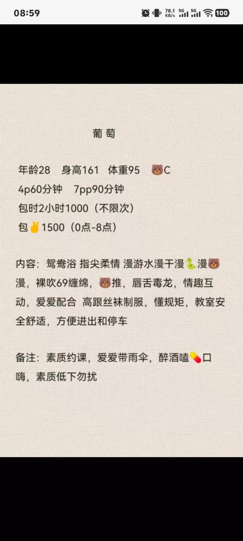 信息分类: 网友投稿-外围小姐地区: 四川-成都年龄: 25岁-30岁颜值身材: 颜值较好,胸大肤白,下面紧,运动有感觉,本人也很配合各种姿势。价格: 单次400双次700包夜1500环境设备: 自带公寓服务项目: 胸推,69,毒龙,情趣制服丝袜